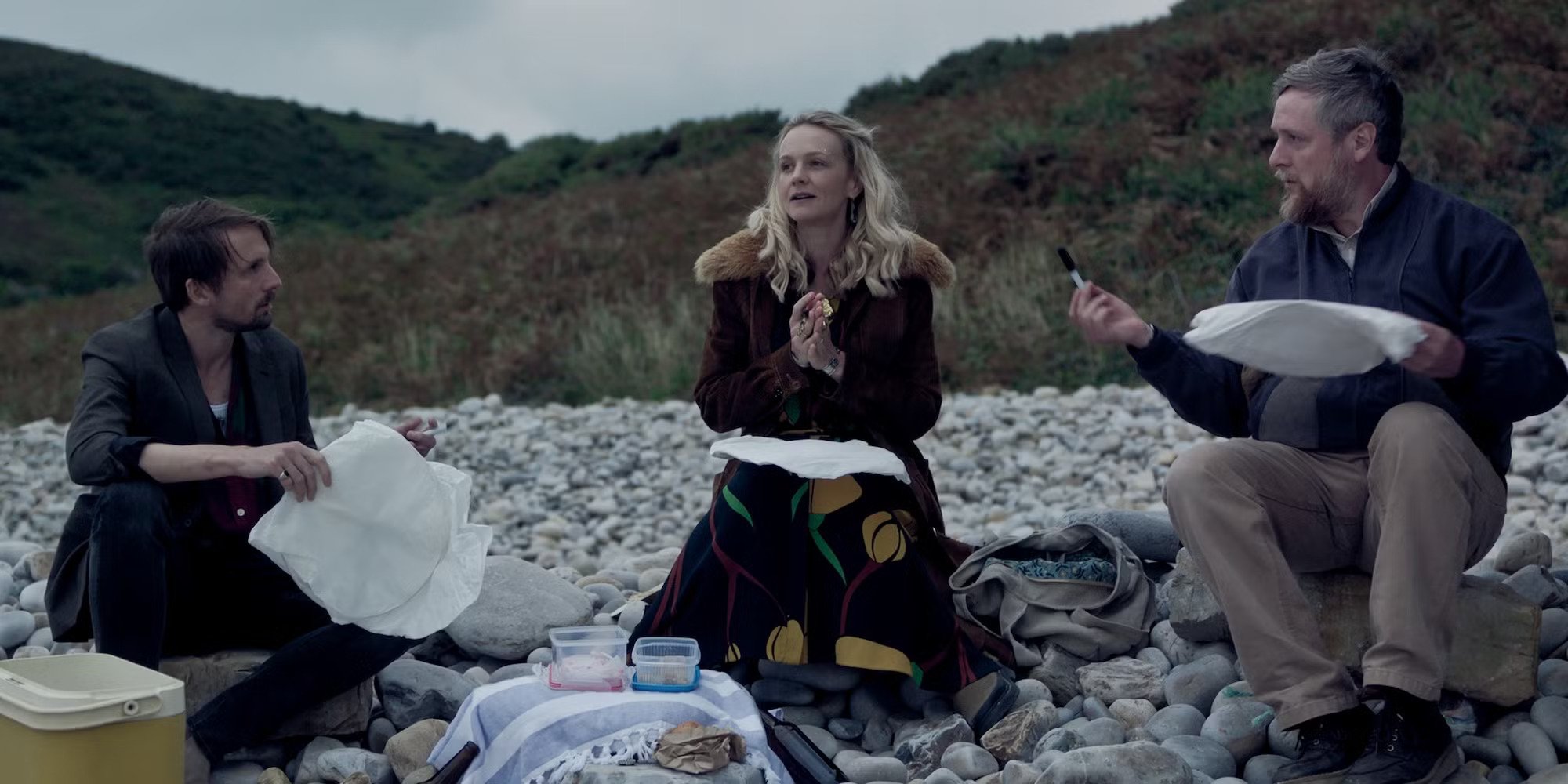 Herb is immediately wary of Charles and the island. He is a stoic and quiet man who deals with his repressed demons by not addressing them and saying very little. Charles, on the other hand, deals with his issues by talking constantly. Their dynamic is fun to watch, though they can grow grating when it is just the two men trying to figure each other out. Thankfully, a couple of new characters are introduced, Nell Mortimer (Carey Mulligan) and her husband Michael (Akemnji Ndifornyen). Nell was the other half of the folk duo opposite Herb. He was not aware that Charles had invited her and it’s clear to see that this surprise has brought up a painful past for him.
